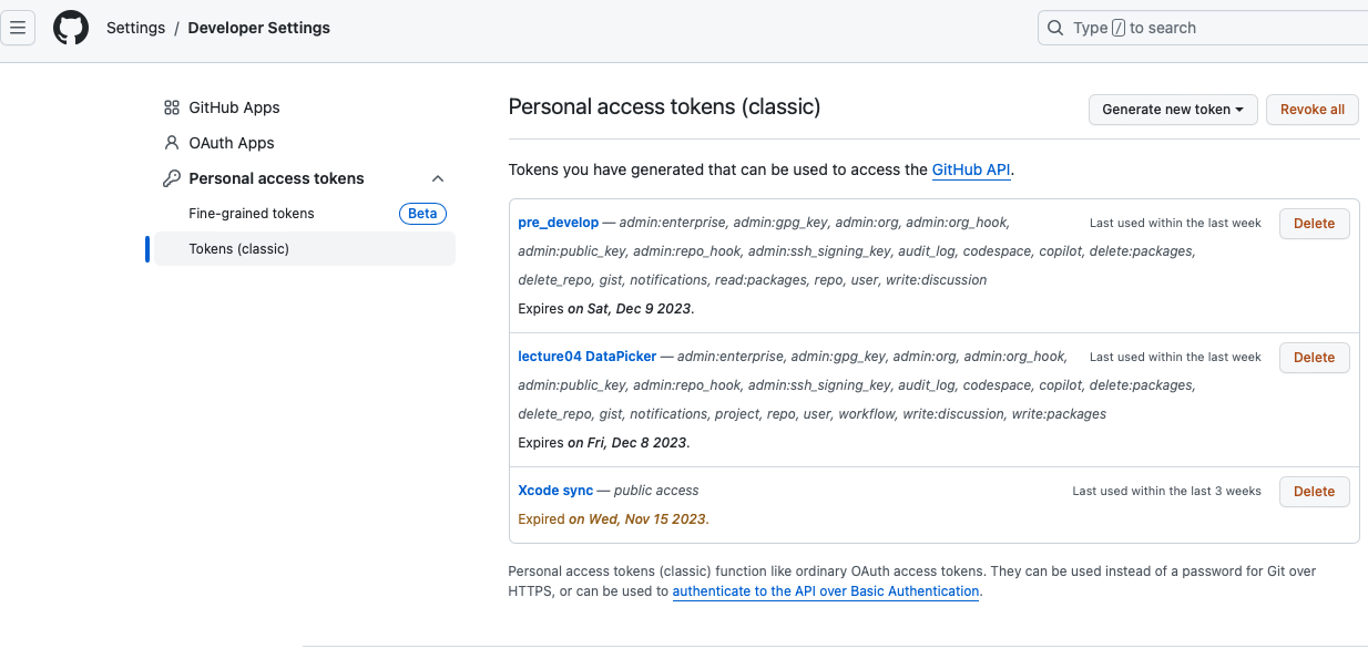 7. 좌측의 generate token 클릭 후 팝업에서 generate new token(classic) 클릭