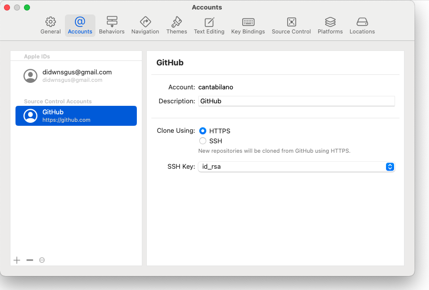 2. Settings 팝업에서 git 계정 등록하기 - 애플 계정 등록 후 github 홈페이지에 가입한 계정메일과 토큰을 작성하면 된다. (토큰 작성은 3번)
