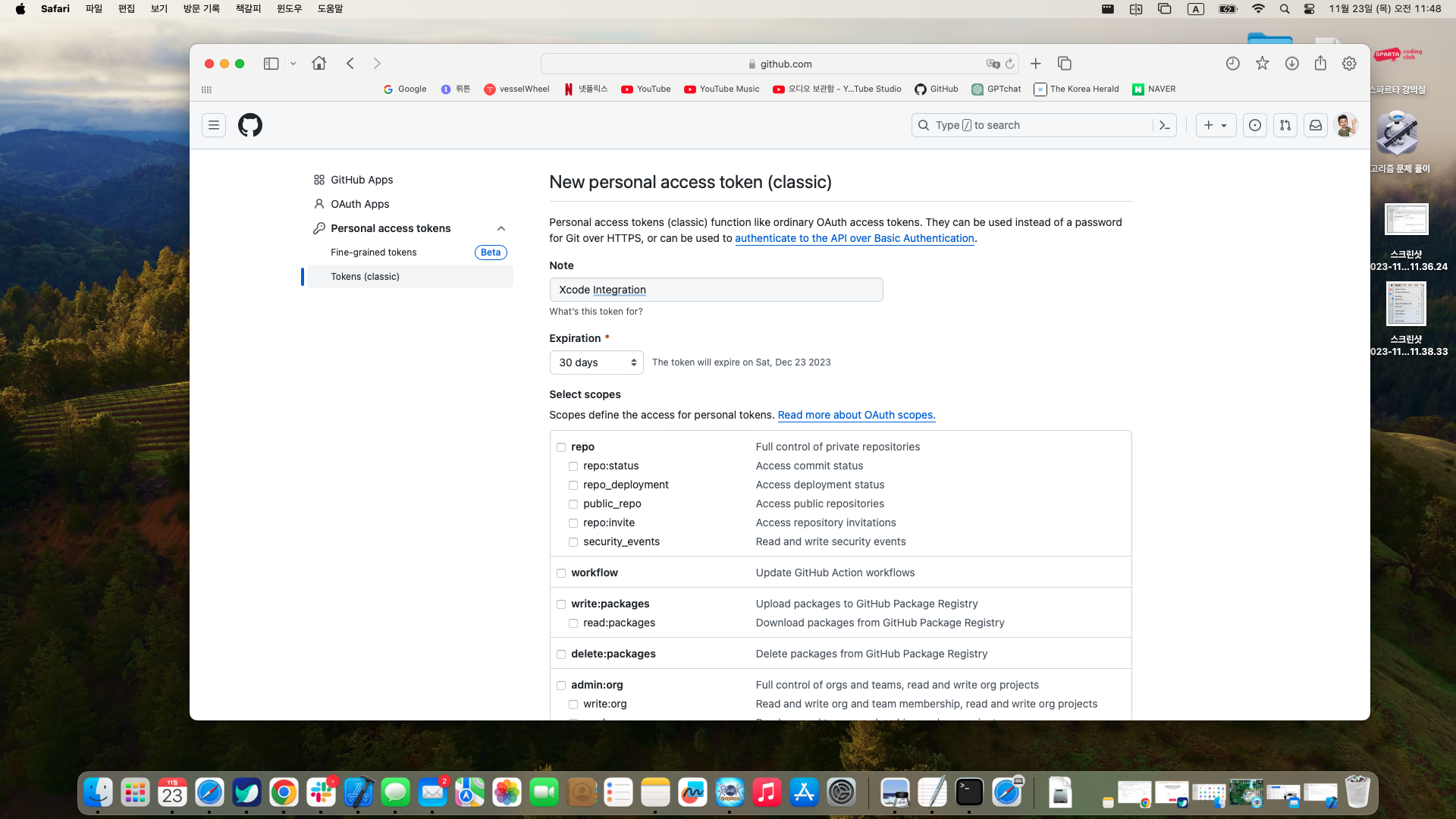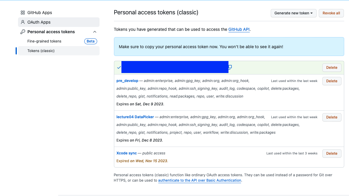9. 증명 후 파란색 부분의 token을 xcode의 settings - accounts - github의 token에 기입 후 계정 연동 완료