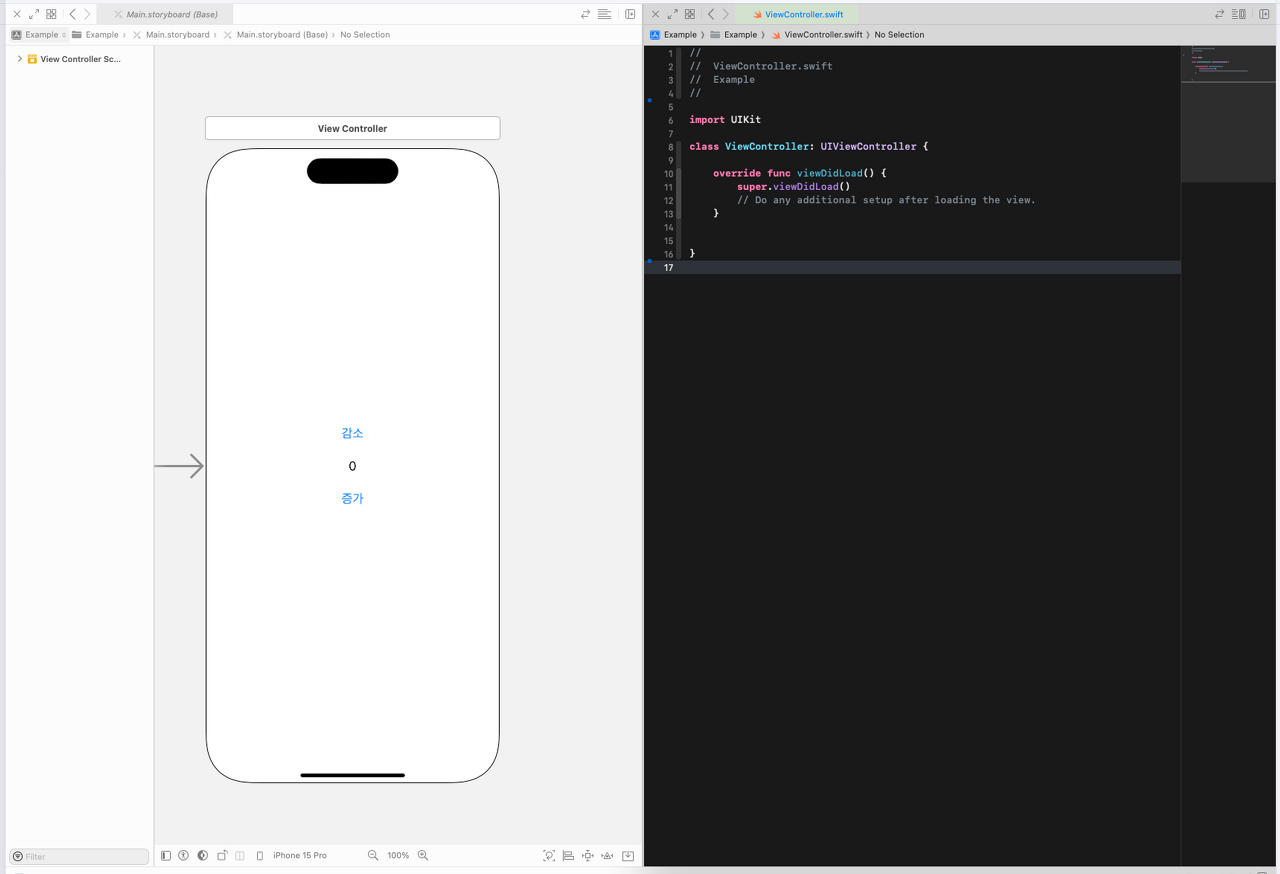 노출되는 목록에서 좌측은 스토리보드상의 객체를 우측은 코드상의 객체를 나타냅니다.