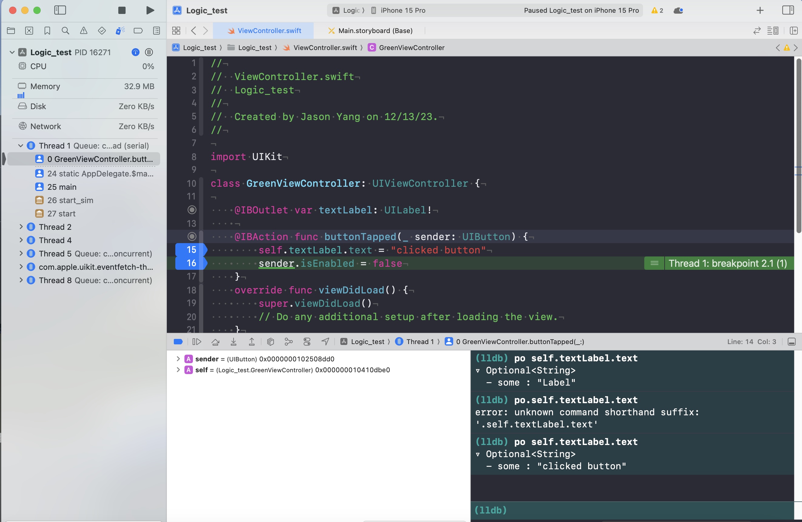 4. textLabel.text를 “버튼을 클릭했습니다”로 설정한 이후 시점의 브레이크 포인트가 작동했을 때, LLDB po 명령어를 사용해 textLabel의 text을 출력해 보세요.