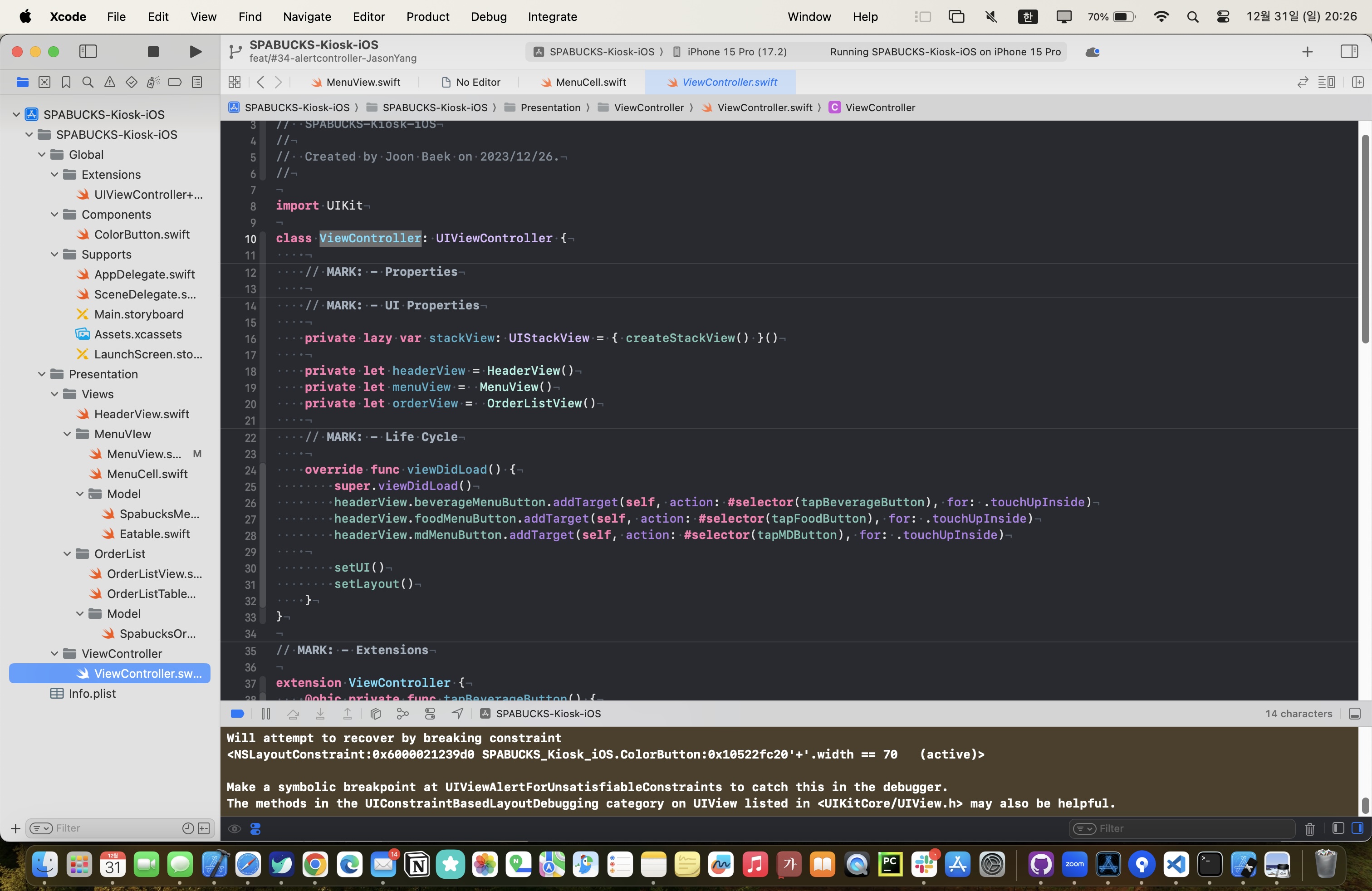 class ViewController: UIViewController { // MARK: - Properties // MARK: - UI Properties ''' // MARK: - Life Cycle (init - Life Cycle - deinit ''' } extension ViewController { // MARK: - Layout // MARK: - @objc // MARK: - Private Methods } // MARK: - UITableView Delegate . . .