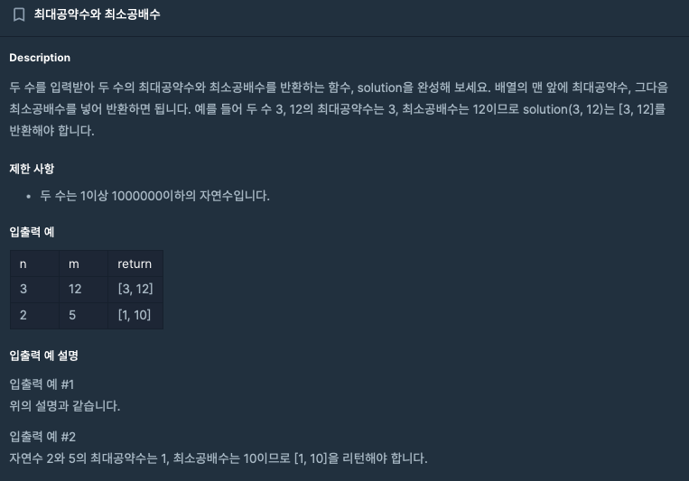 4. 예를 들어, solution(3, 12)를 호출하면, gcd(3, 12)는 3을, lcm(3, 12)는 12를 반환하므로, 최종적으로 [3, 12]가 반환됩니다. 이는 문제에서 요구하는 결과와 일치합니다.