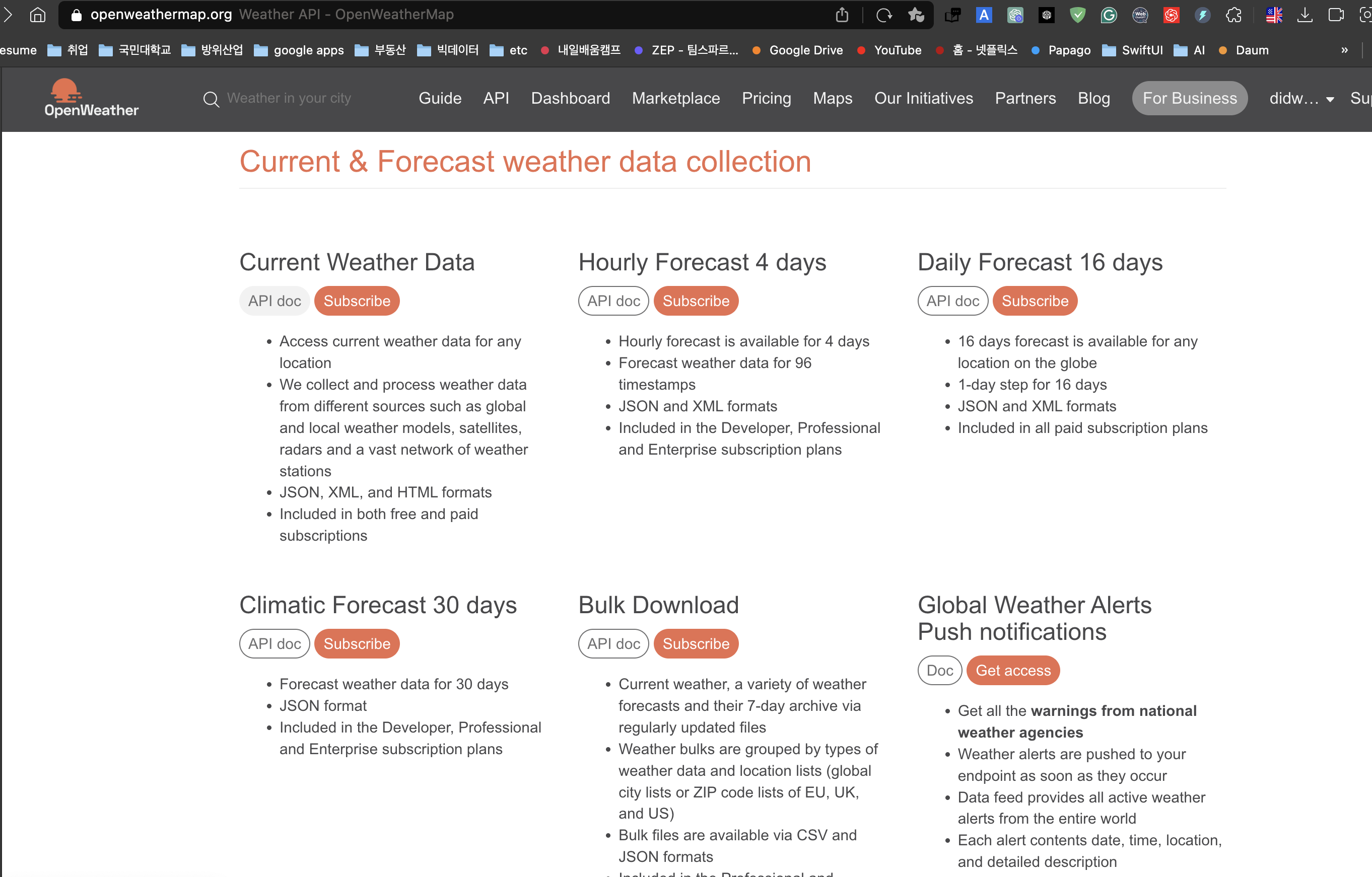 트래픽 제한으로 유료결제를 해야하는 API도 있지만, 3시간 단위 5일치를 무료로 제공하는 Current Weather Data로도 충분하다.