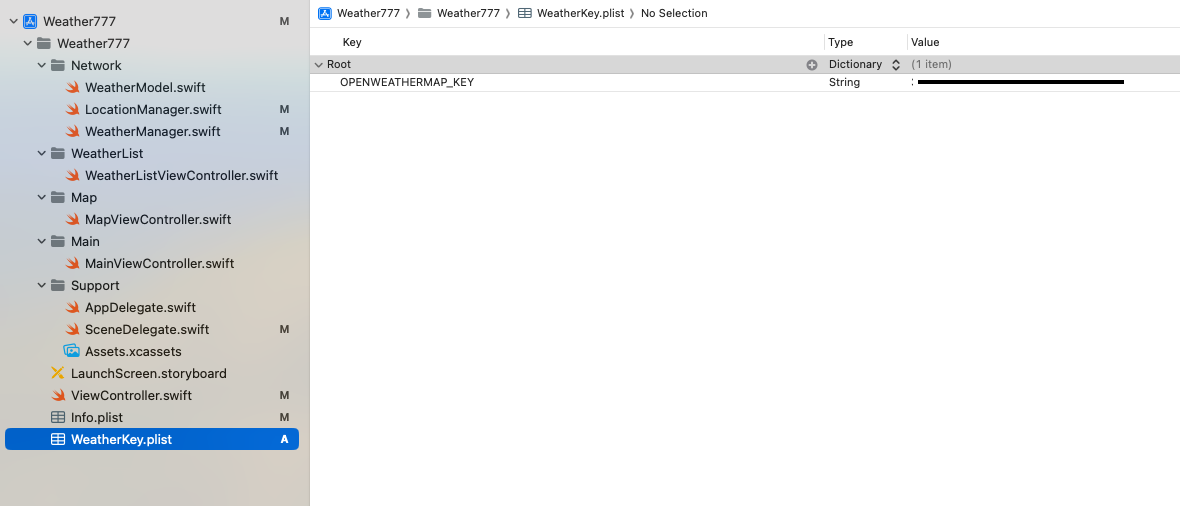 요약하면, 이 코드는 "WeatherKey.plist" 파일에서 API 키 값을 가져와서 `apiKey` 프로퍼티에 저장하는 역할을 합니다. 이렇게 하면 plist 파일 외부에서는 API 키를 직접 볼 수 없으므로 보안을 유지할 수 있습니다.