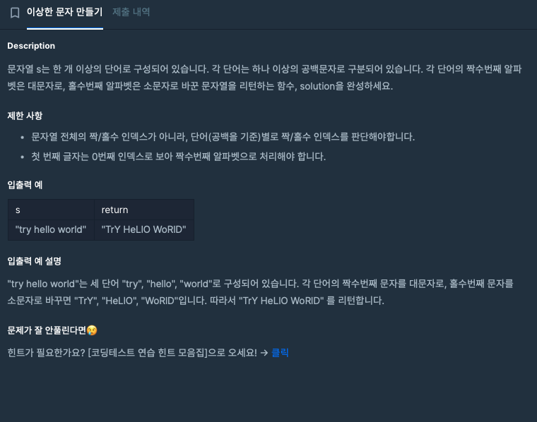 4. 그리고, 순회중인 문자 i가 공백문자자라면 == s 라는 문자열이 들어가 있지 않다면, x = 0 ==> 첫 시작은 0 즉 짝수번째 알파벳으로 처리하여 대문자(uppercased())로 변환한다.