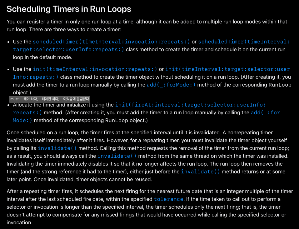 1. 공식문서에 의하면 Run Loop에 타이머를 등록해야한다. 이 때 사용되는 코드가 아래와 같다.
