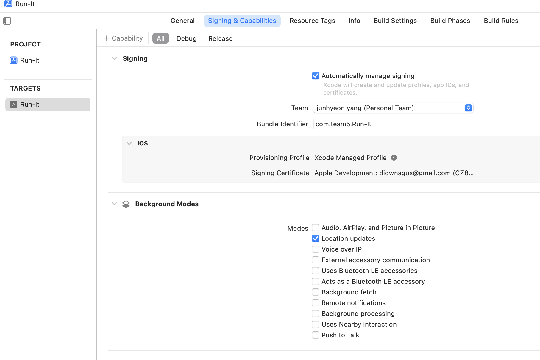 -> allowsBackgroundLocationUpdates 를 위해서는 앱 - TARGETS + Capability에서 [Background Modes]를 추가하고, Location updates를 체크해줘야 정상 작동한다.