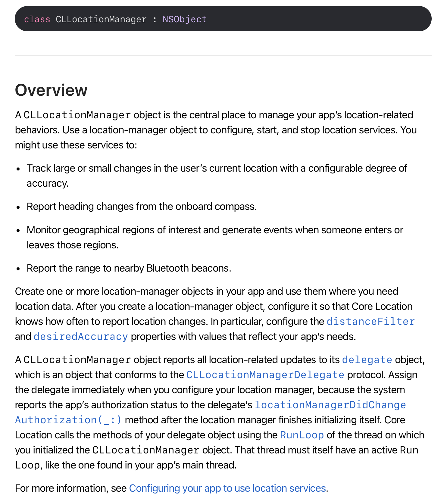 -> CLLocationManager는 NSObject로 CLLocationManager을 사용하고자 하는 곳에서 객체를 생성하고, CLLocationManager에서 지원하는 매소드, 프로퍼티의 상속 및 참조 기능을 제공한다.