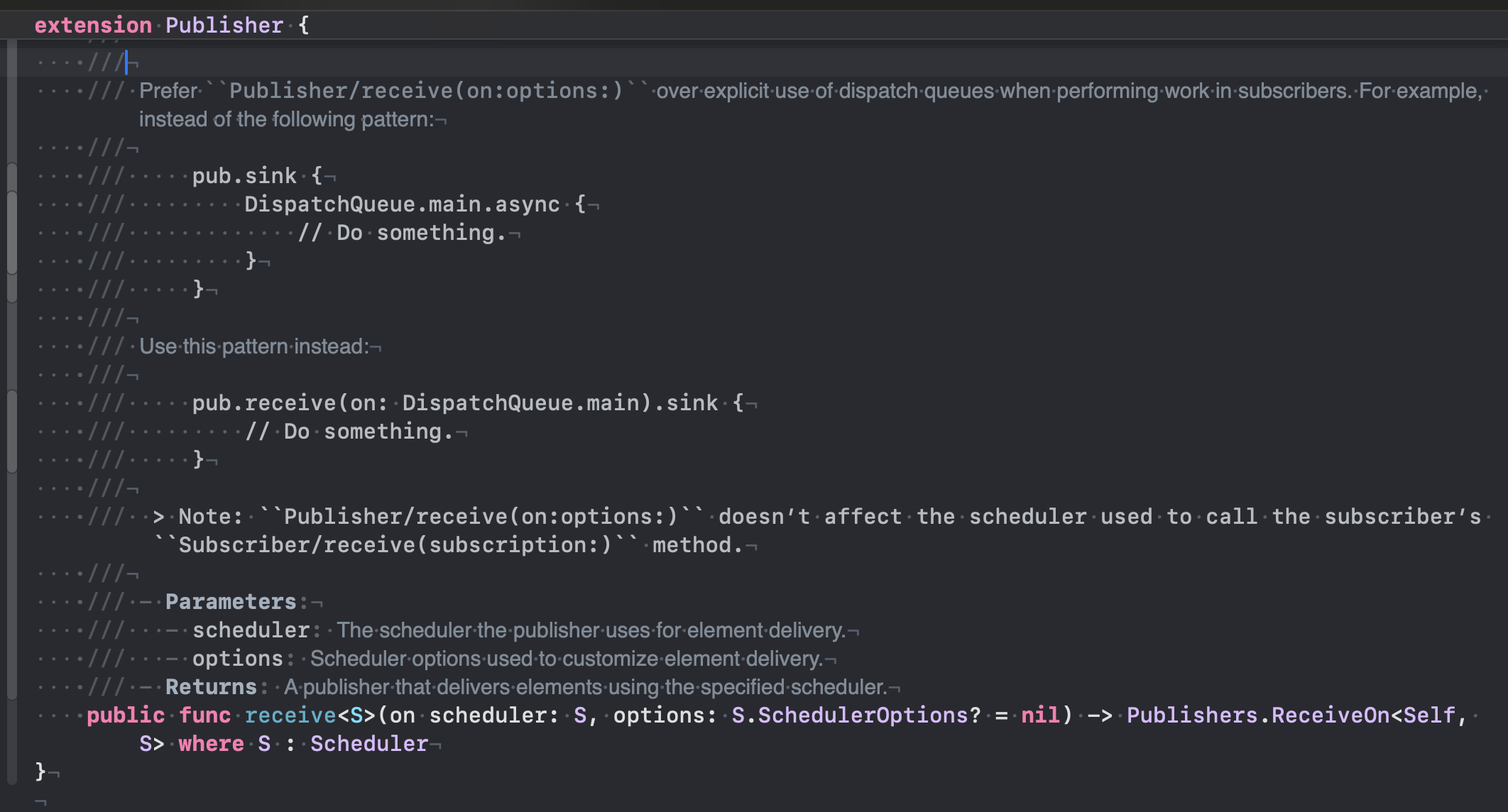 public func receive<S>(on scheduler: S, options: S.SchedulerOptions? = nil) -> Publishers.ReceiveOn<Self, S> where S : Scheduler