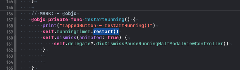 마찬가지로, self.delegate?.didDismissPauseRunningHalfModalViewController()도 델리게이트 패턴으로 restart() 매소드를 호출하고 있어 중복되는 코드이며, 거리값은 재개를 하지 않는 문제점이 발생했다.
