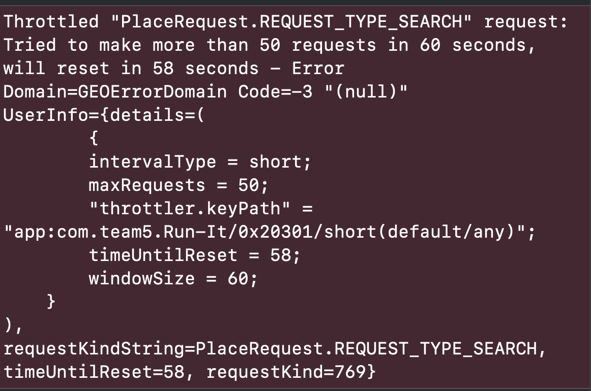 1초 안에 50번 초과의 query 요청을 할 수 없다는 것으로 이것은 MapKit의 서버에서 query 요청수를 제한시켜 놓은 것으로, 만약 유료 지도 API를 사용했다면 비용 상승의 효과로 이어진다.